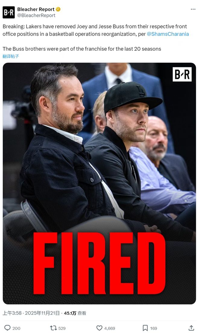 洛杉矶湖人管理层的地震终于爆发!据NBA名记沙姆斯报道,新老板马克-沃尔特挥舞屠刀,一次性解除了乔伊-巴斯和杰西-巴斯在管理层的所有职务,同时整个球探部门被全员清洗。这场酝酿数月的权力更迭,标志着巴斯家族对湖人长达数十年的掌控进入倒计时。